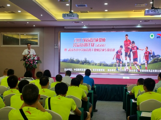7月8日,2017年校园足球教师公益培训计划(武汉站)暨武汉市中小学体育骨干教师足球专项培训在我校启动。此次活动由中国教师发展基金会、武汉市教育局主办,江汉大学承办,安踏体育用品有限公司协办。