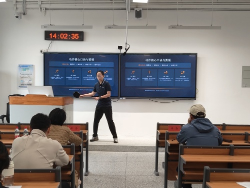 各位参赛教师各展所长、各具特色,将专业教学技巧与课程育人理念深度融合,呈现了多堂高质量的体育教学模拟课。技术课堂教学中,钟璧蔚老师主讲高尔夫技术理论与实践课程,聚焦上杆至顶点动态时序,详解身体与手臂动作要领、协调发力及科学训练方法,融入AI 数据驱动教学,实现挥杆轨迹数字化分析,助力高效掌握标准挥杆技能。宋晓婉老师围绕正手攻球技术展开教学,运用四步分解教学法,通过镜面示范让技术要点直观传递,针对学生腰腹协调性差、发力顺序混乱的问题,创新引导学生脱离球拍感知蹬转发力与挥拍轨迹,高效破解教学难点;夏建恒老师聚焦篮球破二三联防战术,将战术推演与个体落位相结合,通过战术板讲解、传球轮换练习等环节,辅以精细化落位图示,助力学生精准建构集体战术中的空间意识;黄锦瑞老师在橄榄球旋转球技术教学中,以标准示范和清晰分解讲解,将出手角度、手指拨球发力点等关键要点逐一呈现,让学生在直观感知中建立正确技术表象;余瑛老师进行高尔夫球准备姿势教学时,通过握杆手法演示、力度分级讲解等环节,配合关节角度标记与动作定像对比,实现学生准备姿势的规范统一。