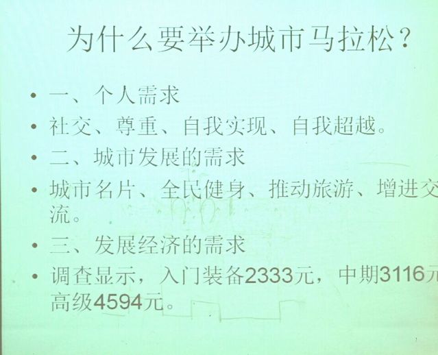 刘老师用图文并茂结合短视频的形式,生动丰富地展示出马拉松各级各类赛事中的赛事管理与竞赛组织裁判及细节控制的不同。大到赛事路线选择、出发与终点安排、政府支持的战略意义,小到诸如志愿者分类及补给点摆放水杯的细节等事无巨细都一一加以详细的说明。